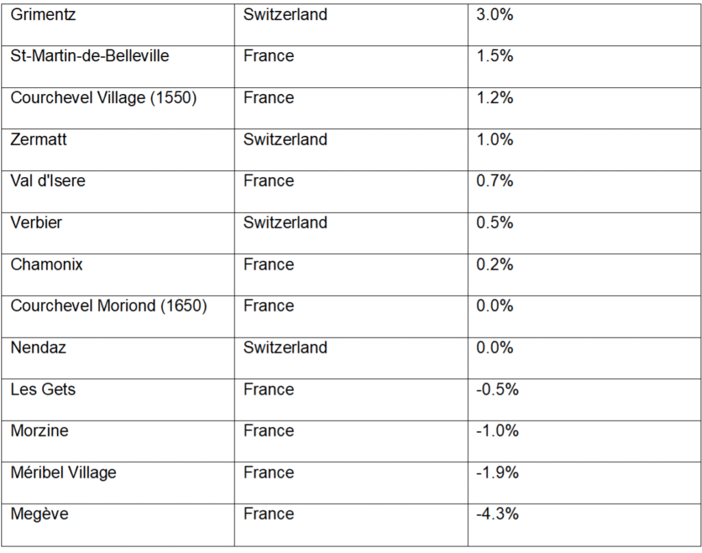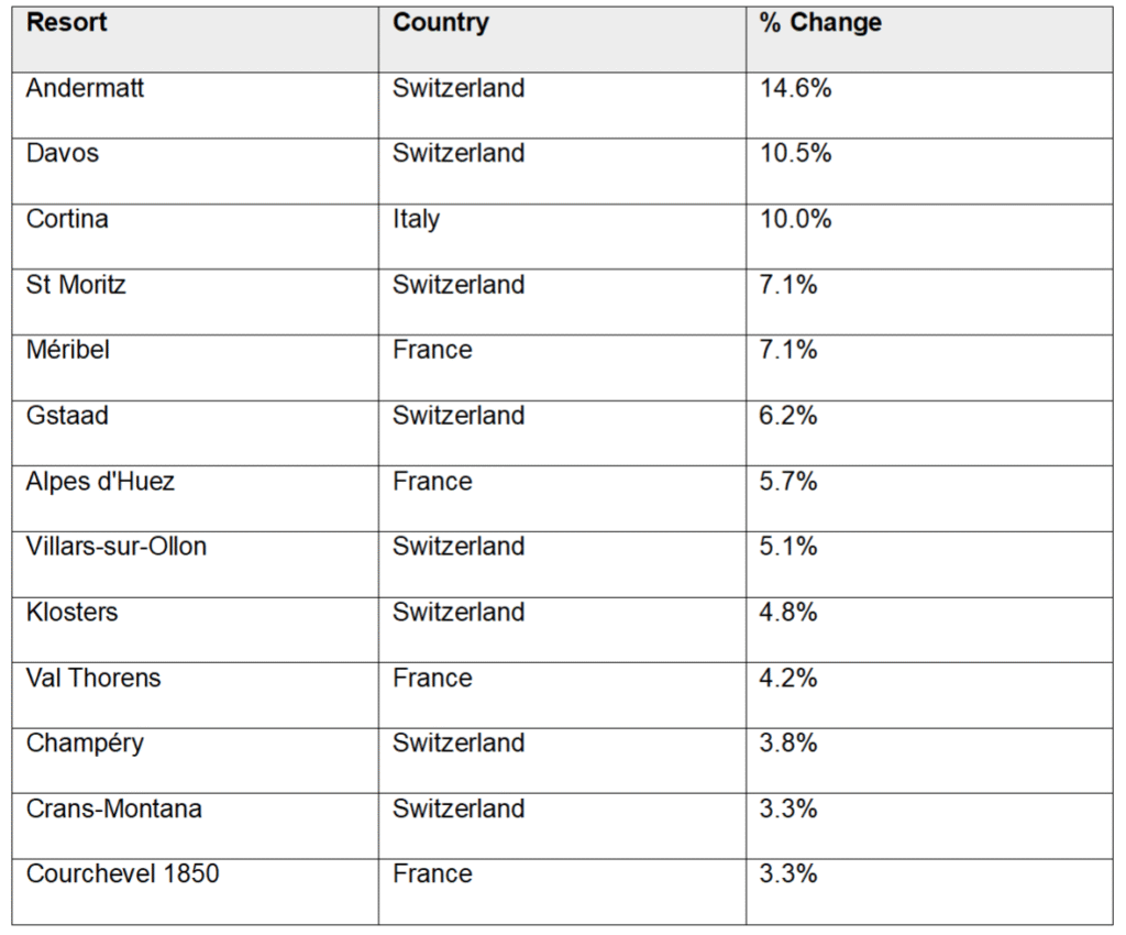 Annual % price change year to June 2025. Source: Knight Frank Research. Note: The annual price change of a chalet in a prime location
